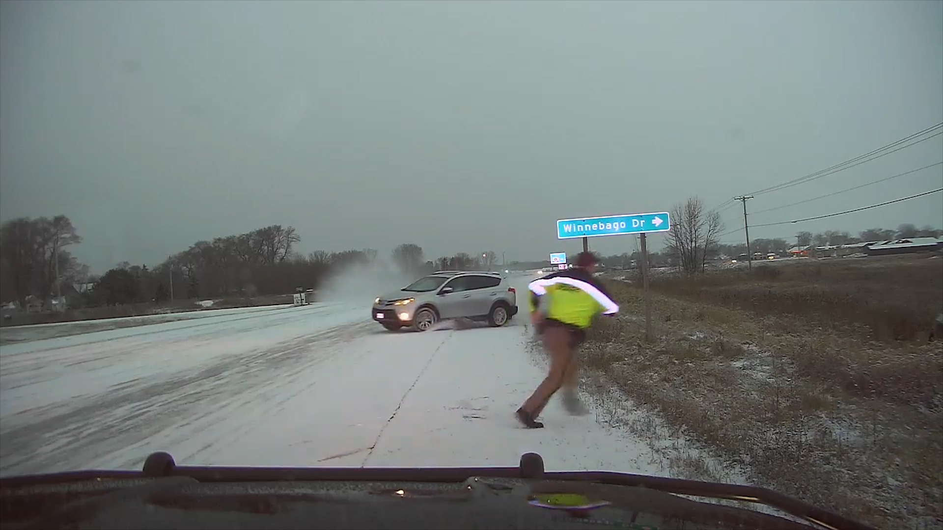 A sheriff’s office in Wisconsin is reminding drivers to go slow in winter weather after dashcam video captured a deputy almost being hit by an “out-of-control” car skidding on a snowy road.