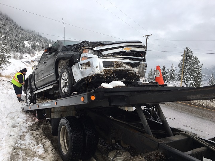 On Highway 97 near Crystal Waters Road, north of Oyama, a black Chevrolet Silverado lost control and hit the ditch. The front-end of the 3500 HD model sustained serious damage, but police report the driver was OK.