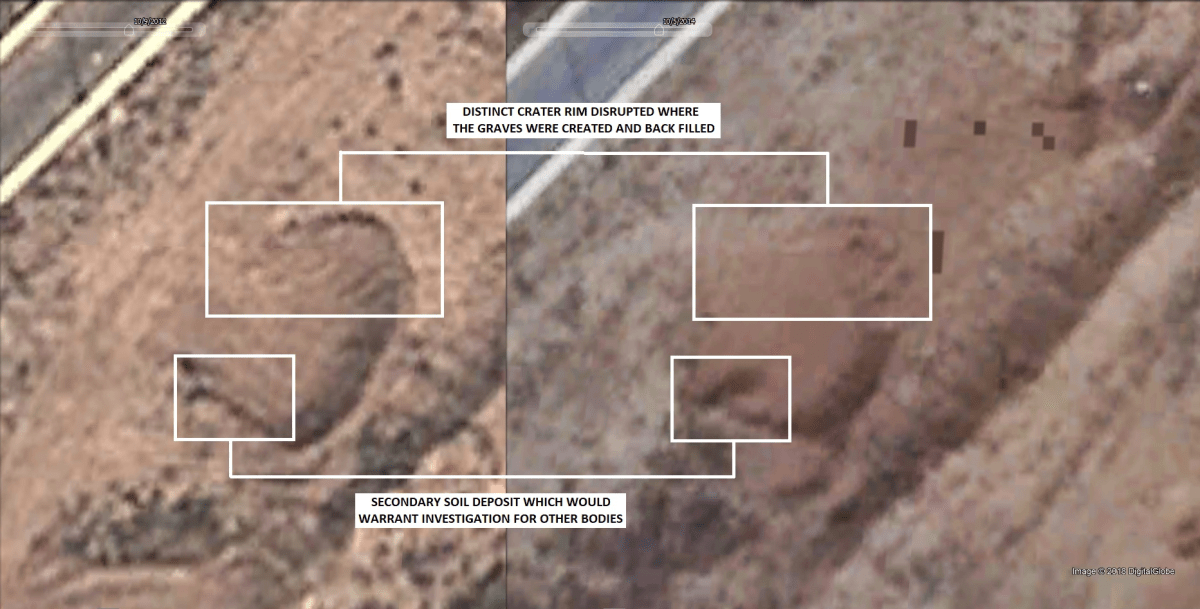 “Examining the site through Google Earth’s historical archive, there is no overt indication that the graves have been disrupted since the time they were created by the IS executioners. As such, the crime scene likely remains intact, though weathered by time.”
