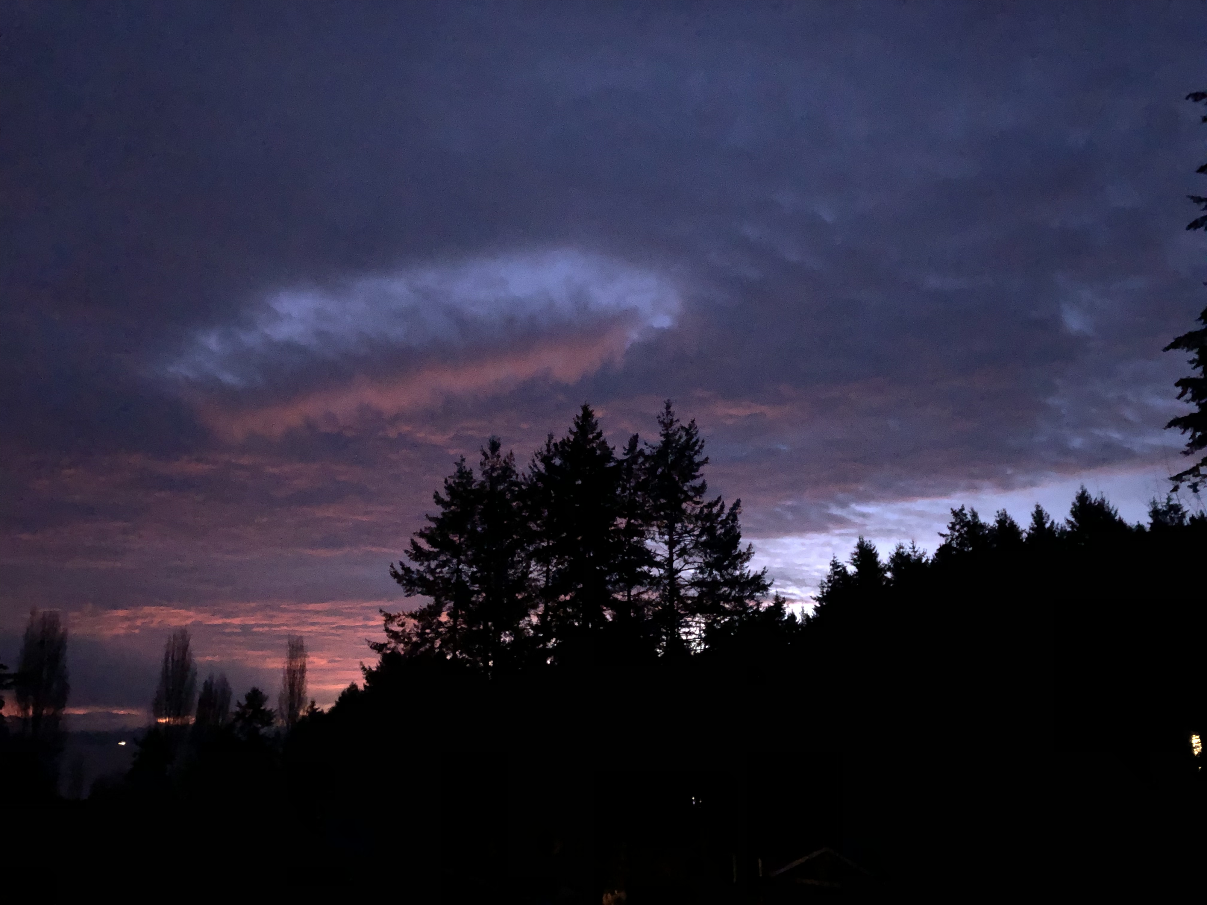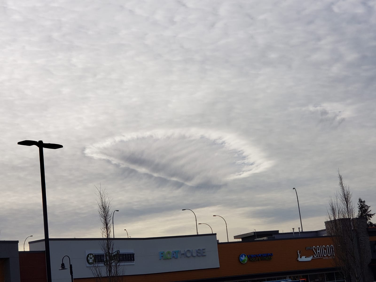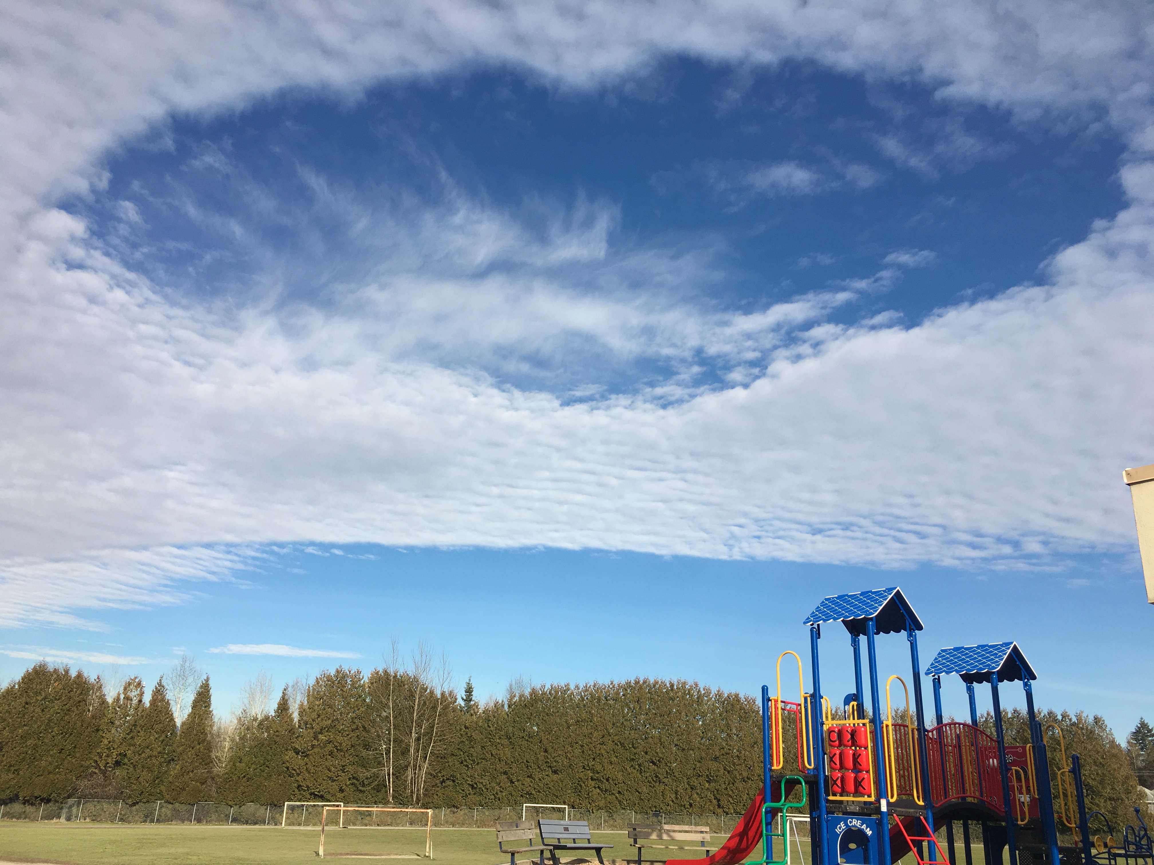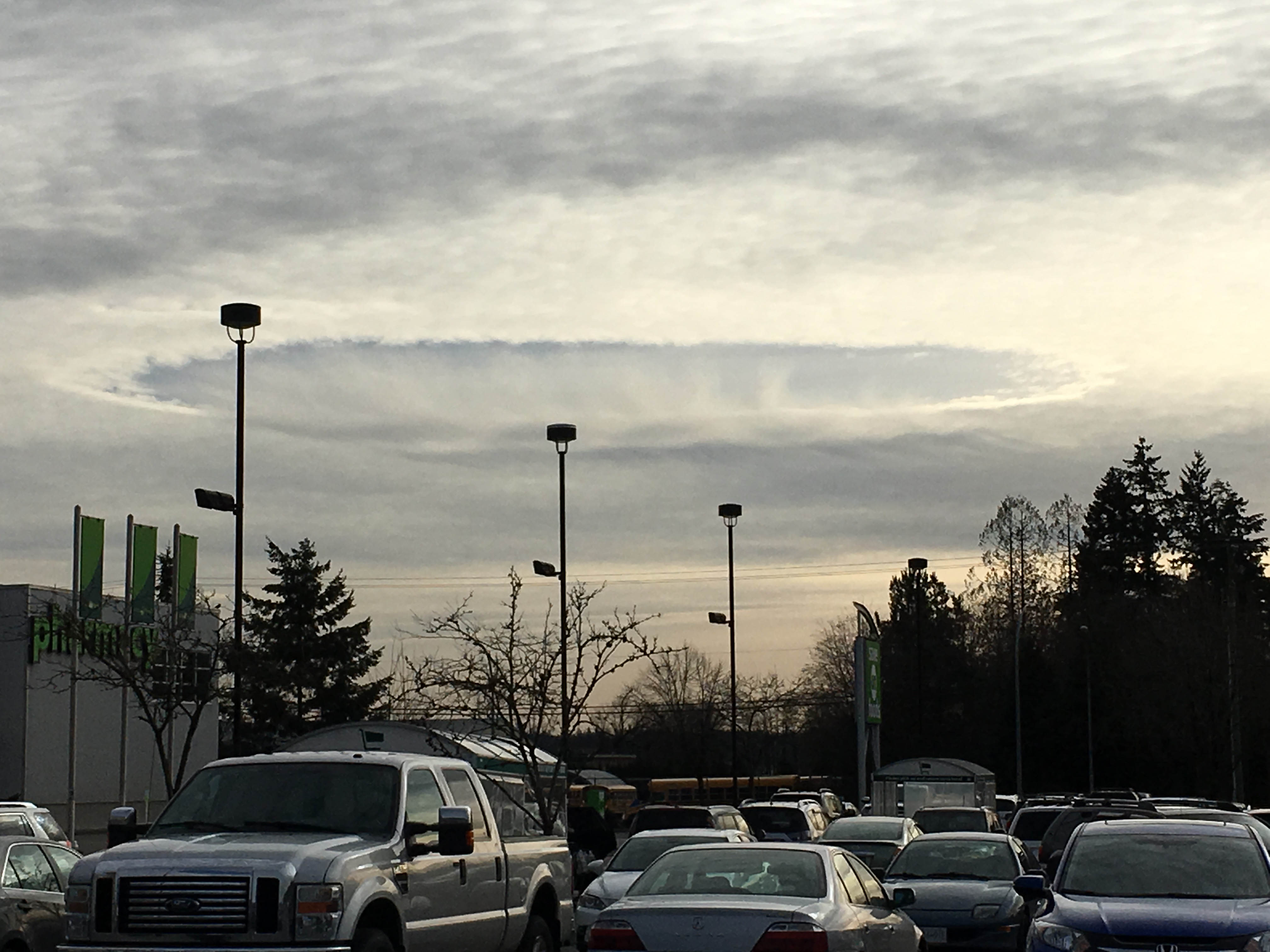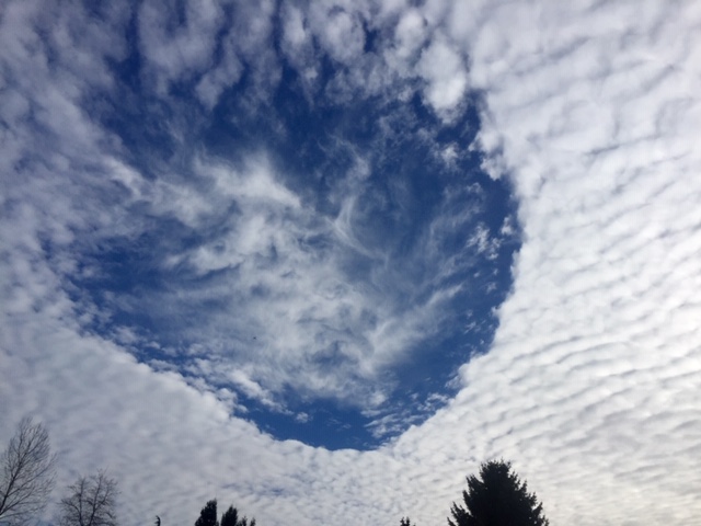 They’re called “fallstreak holes,” and they only happen in a nice layer of altocumulus or cirrostratus clouds.