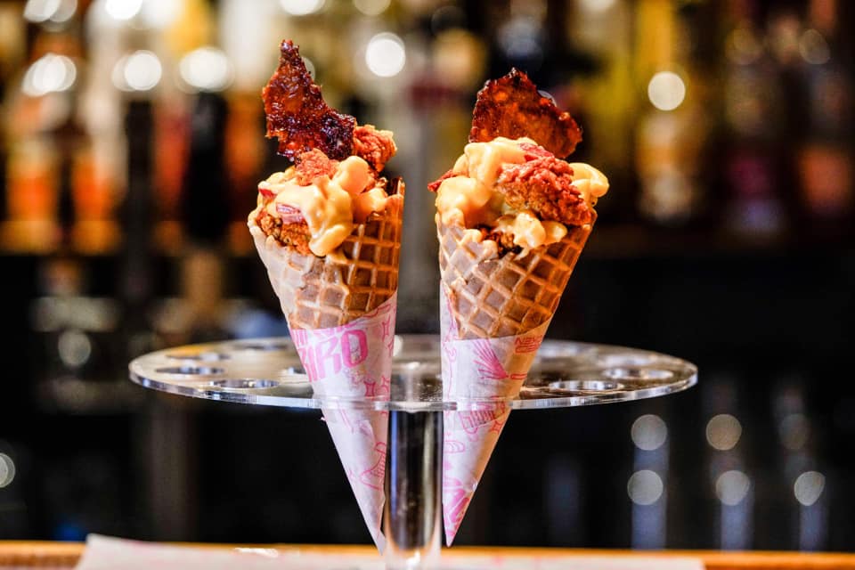 The top dog of 2019 was loaded with pimento macaroni and cheese, fried chicken bites, and fried chicken skin all wrapped in a waffle cone.