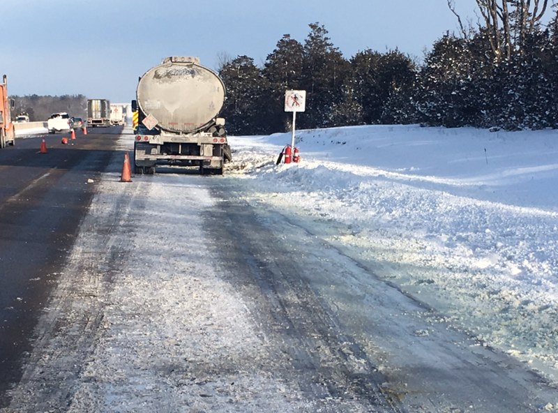 Ministry of Environment officials were on route to deal with the spill, and one lane of the eastbound lanes near the collision was blocked. OPP were on scene to deal with the collision.