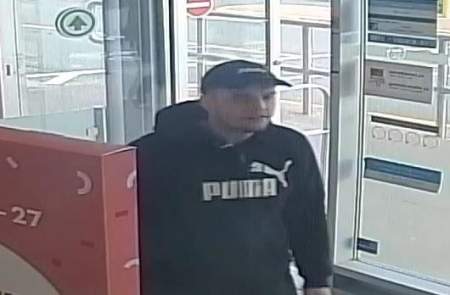 He was wearing a black Puma sweater, a ball cap, black pants and black shoes at the time of thefts.