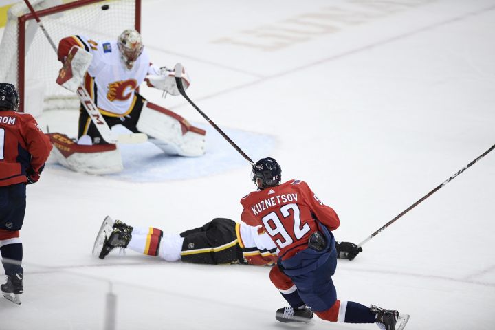 With Calgary’s Mikael Backlund off for holding, Kuznetsov weaved his way into the Flames’ zone before firing a wrist shot past goaltender Mike Smith.