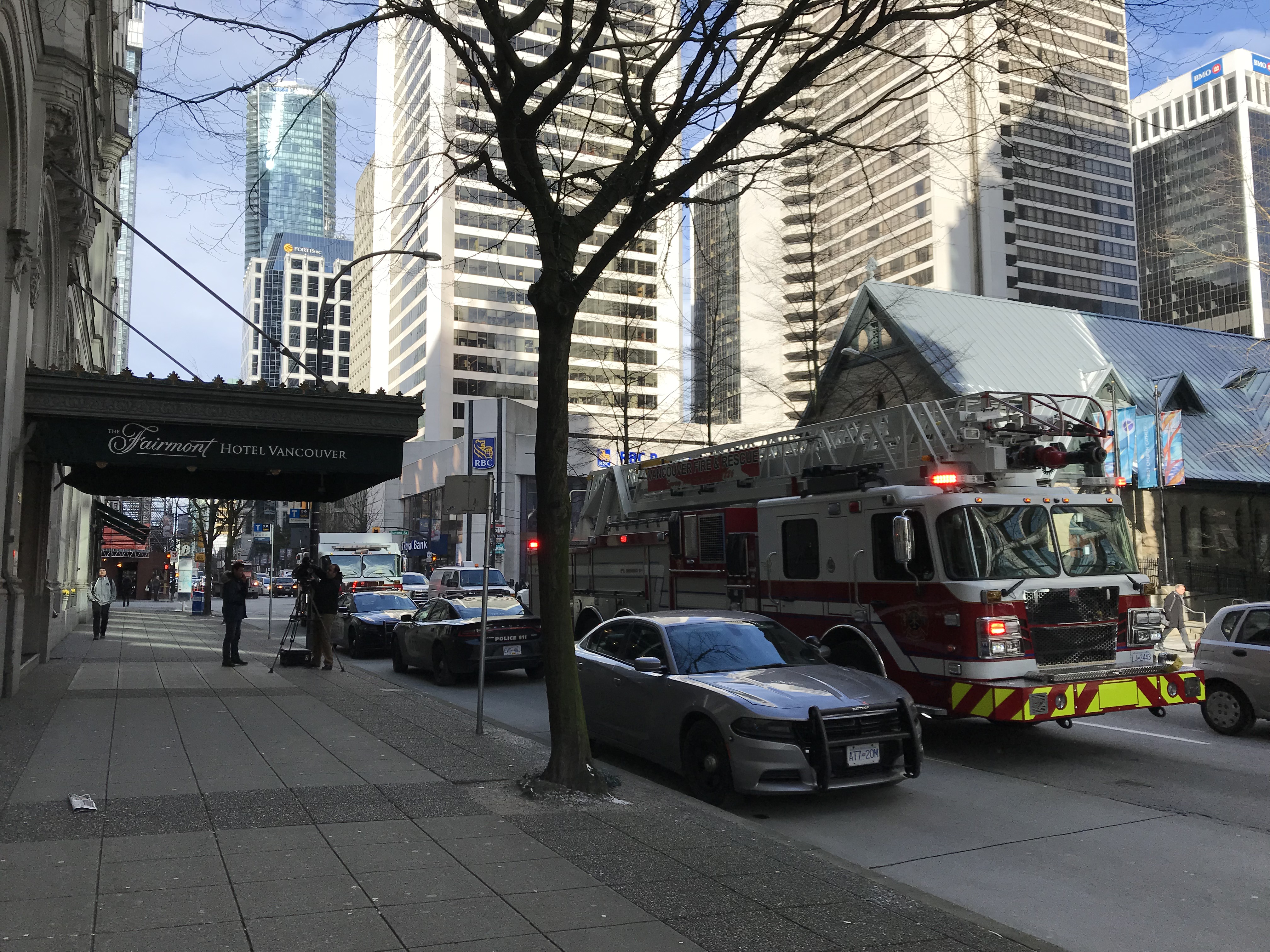 Vancouver police say a disturbed man locked himself on an upper floor of the Hotel Vancouver and lit a small fire.