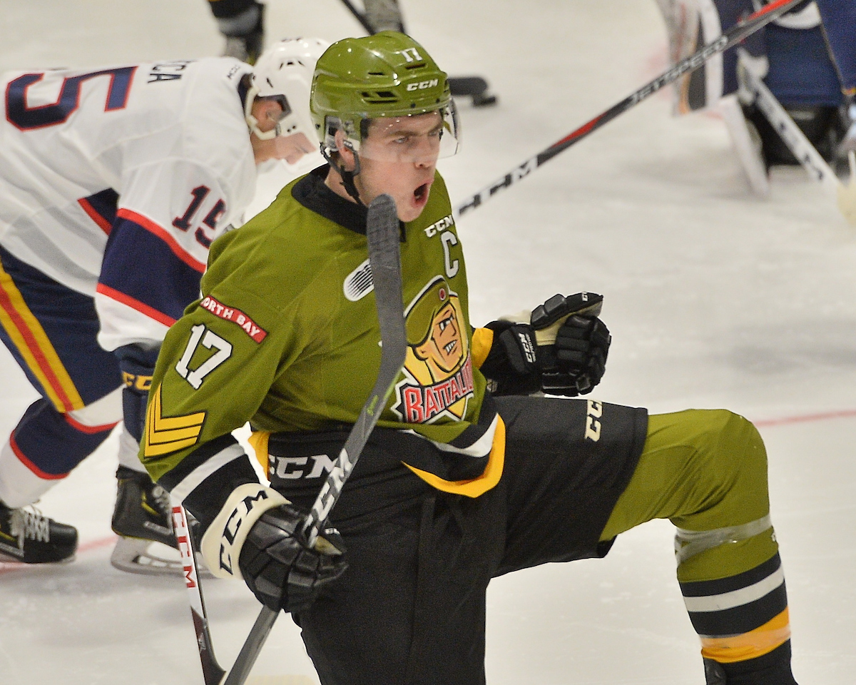 NORTH BAY, Ont. – Justin Brazeau finished off a hat trick in overtime and added an assist as the North Bay Battalion edged the Flint Firebirds 5-4 on Thursday night in Ontario Hockey League action.