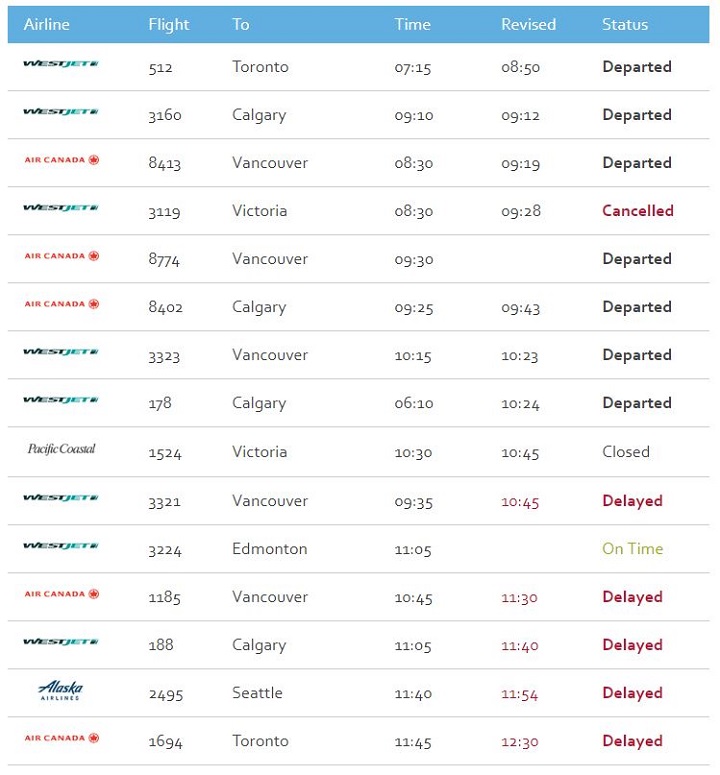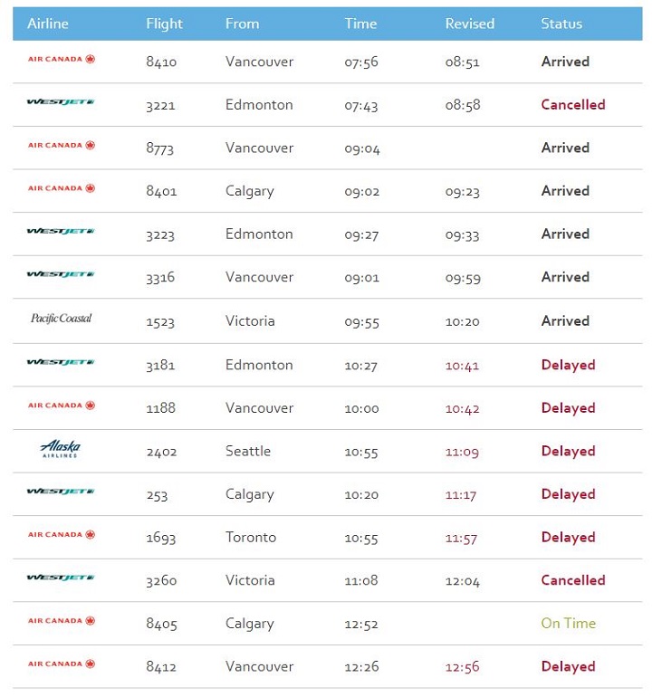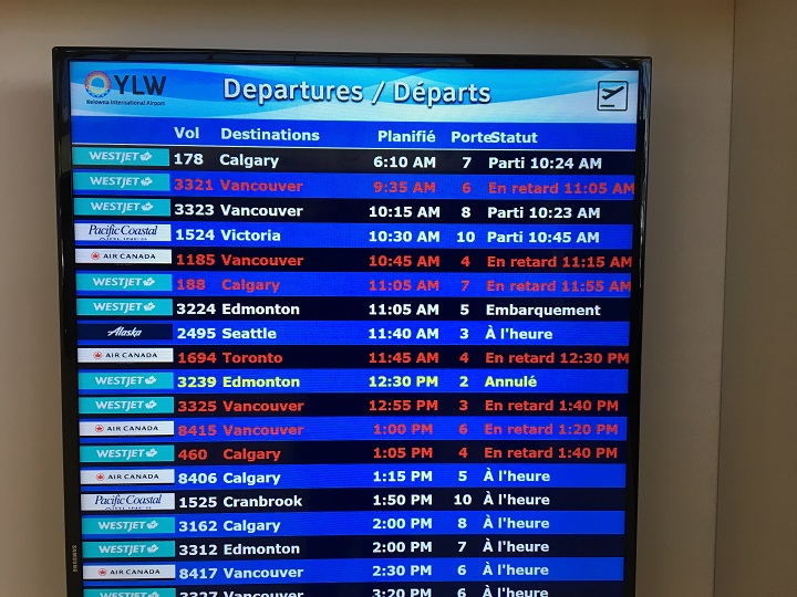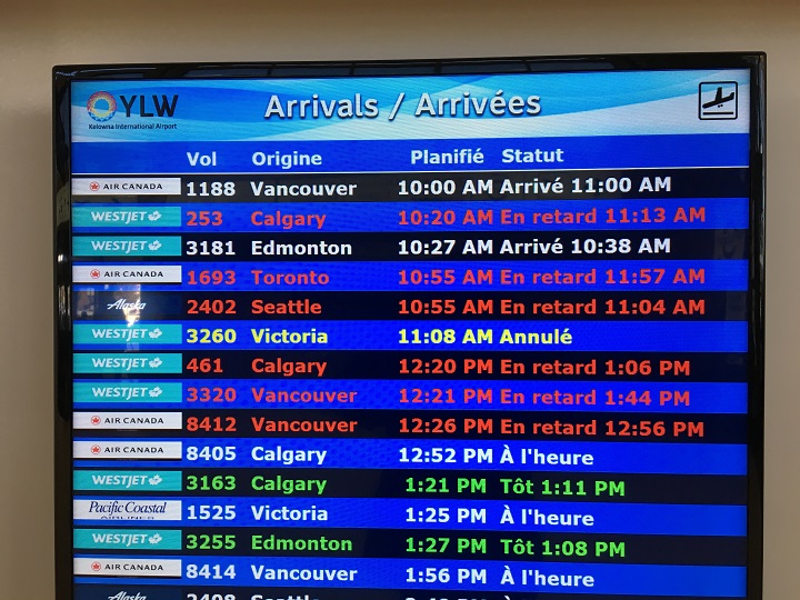 According to the airport, “several flights in and out of YLW are delayed or cancelled due to weather at other Western Canadian and U.S. airports.”