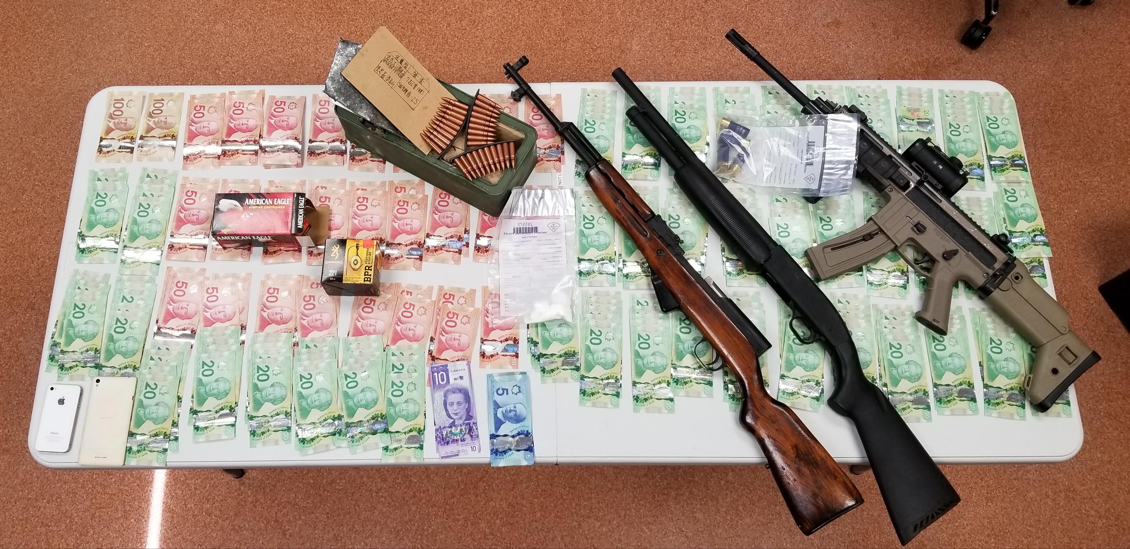 According to police, the seizure included three firearms, ammunition, thousands of dollars in cash, as well as powdered cocaine and cocaine pills.