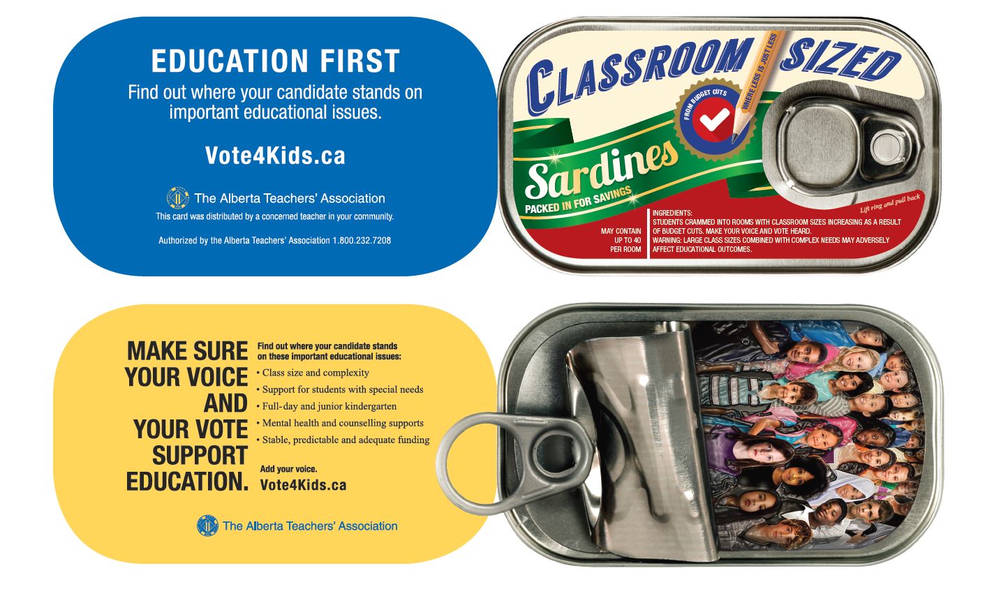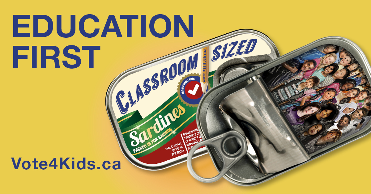 Teachers will be distributing 400,000 postcards — that look like sardine cans with kids in them — across the province to highlight the issue of class size.