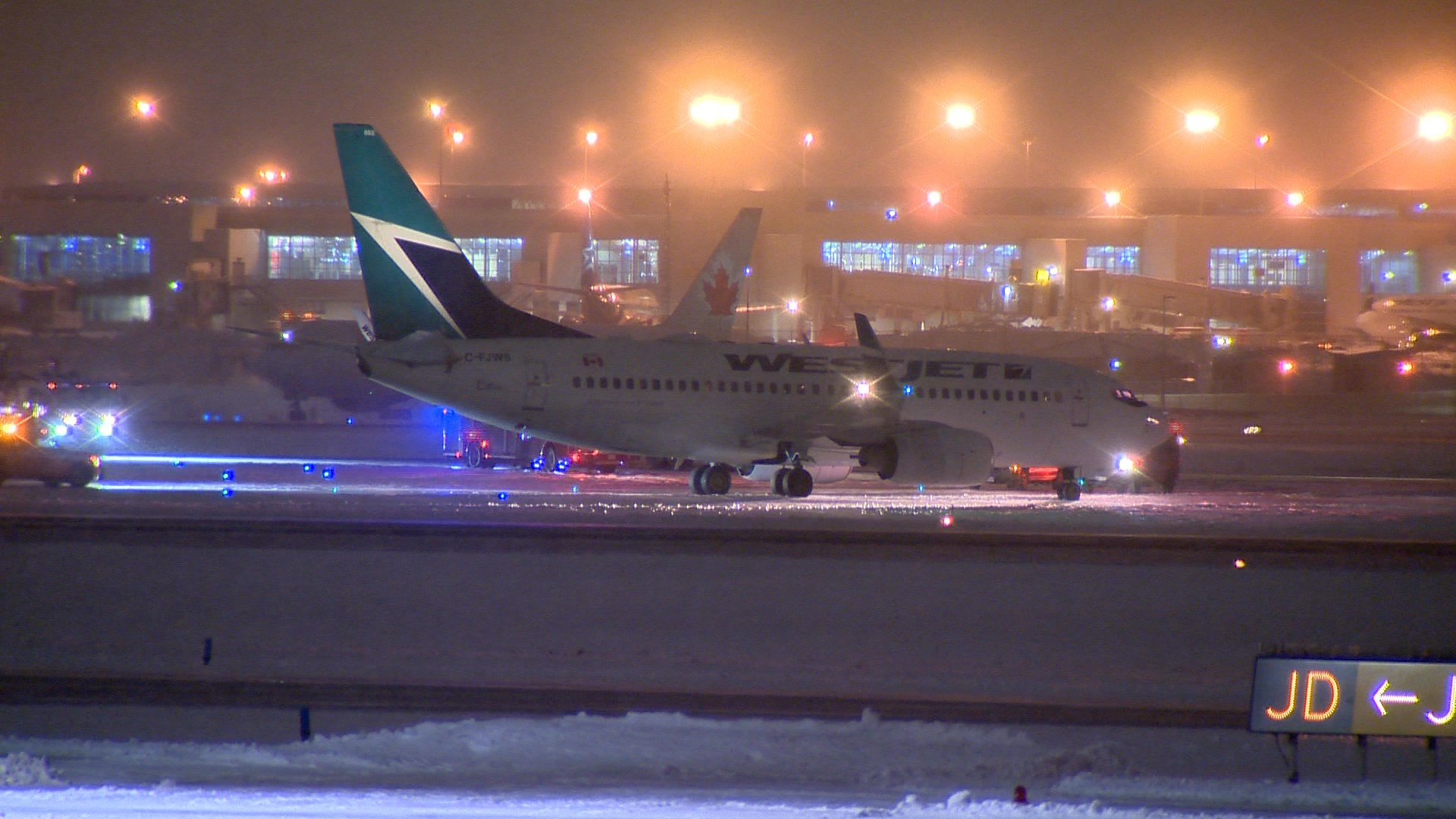 Officials from the airline said flight WS670 landed around 10 p.m. and became stuck in snow after turning off the runway and onto the taxiway.