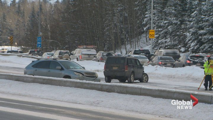 “The female driver of the Lexus reportedly exited her vehicle and was speaking with another motorist who had stopped to assist her when a black Dodge Nitro, travelling west on Whitemud Drive, slid into her and came to a stop in the far right lane of the freeway,” police said in a news release Saturday evening.