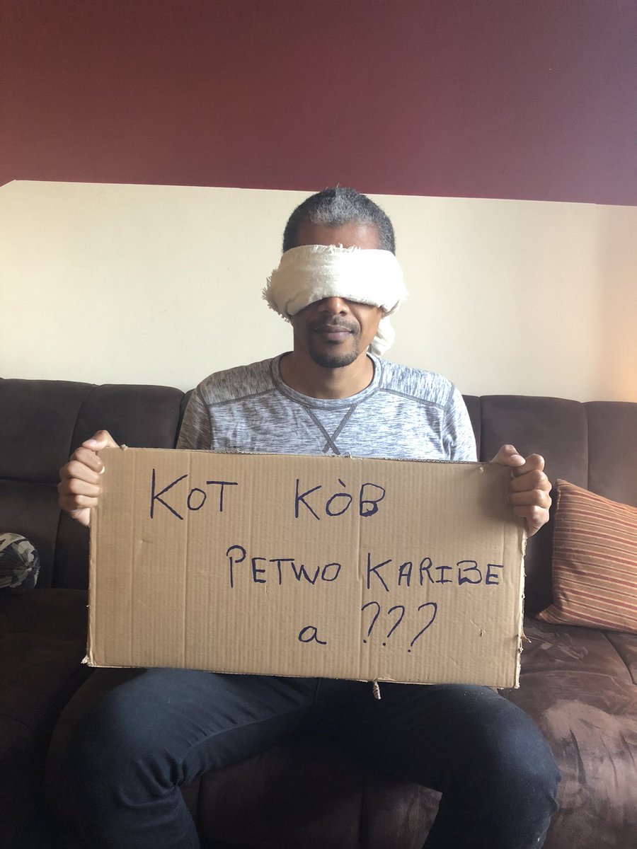 In a photo posted to Twitter last summer, Gilbert Mirambeau Jr. sits on a couch in Montreal, wearing a blindfold and holding up a cardboard sign with a handwritten Creole message that reads: “Where is the PetroCaribe money?”