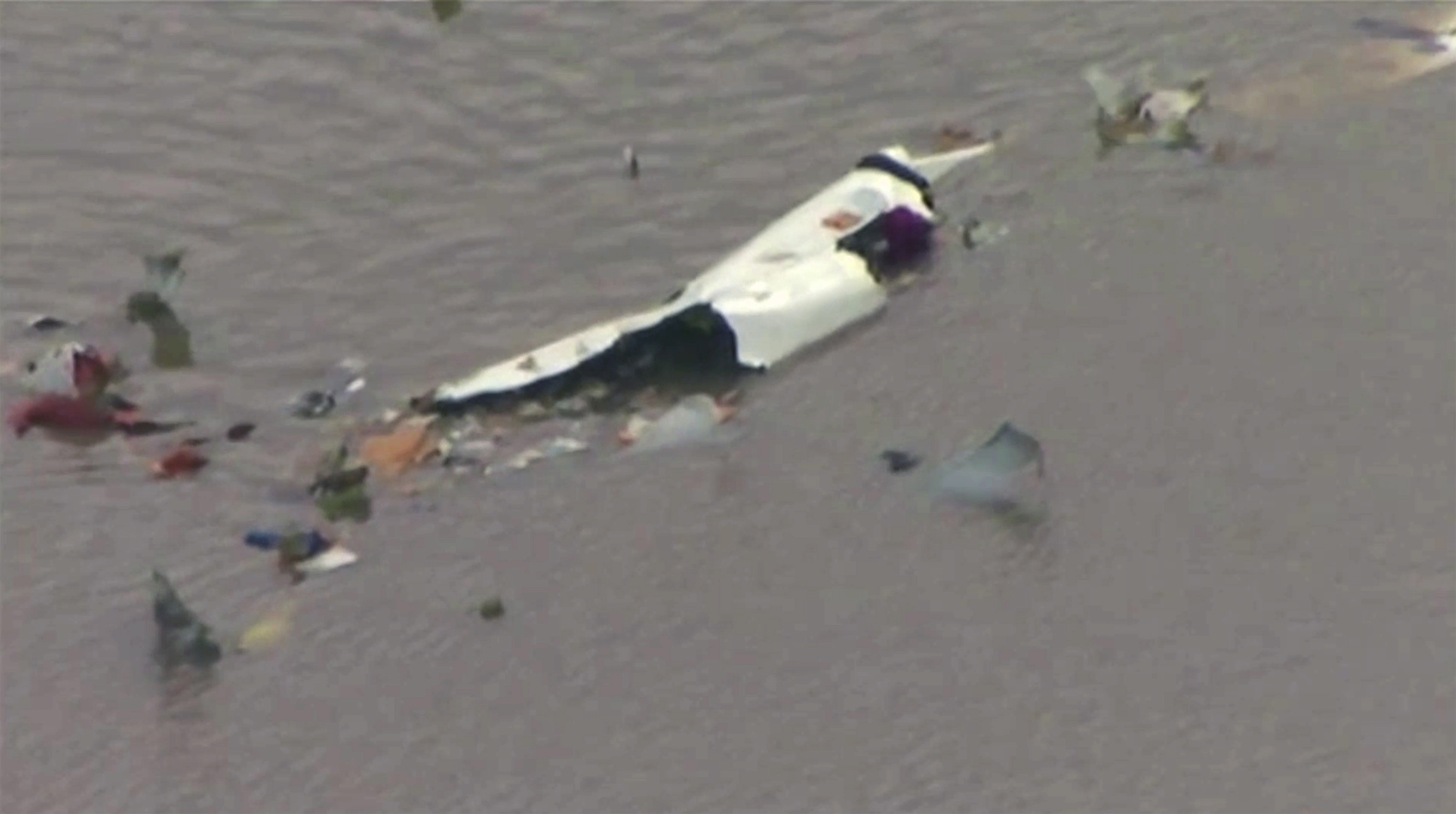 Aerial footage shows emergency personnel walking along a spit of marshland flecked by debris that extends into the water.