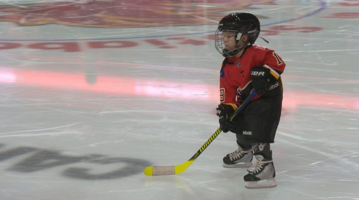 After signing contracts and donning Calgary Flames jerseys, a group of kids under 12 laced up their skates and hit the ice at the Scotiabank Saddledome on Sunday to become hockey players for the team’s Flame for a Day event.