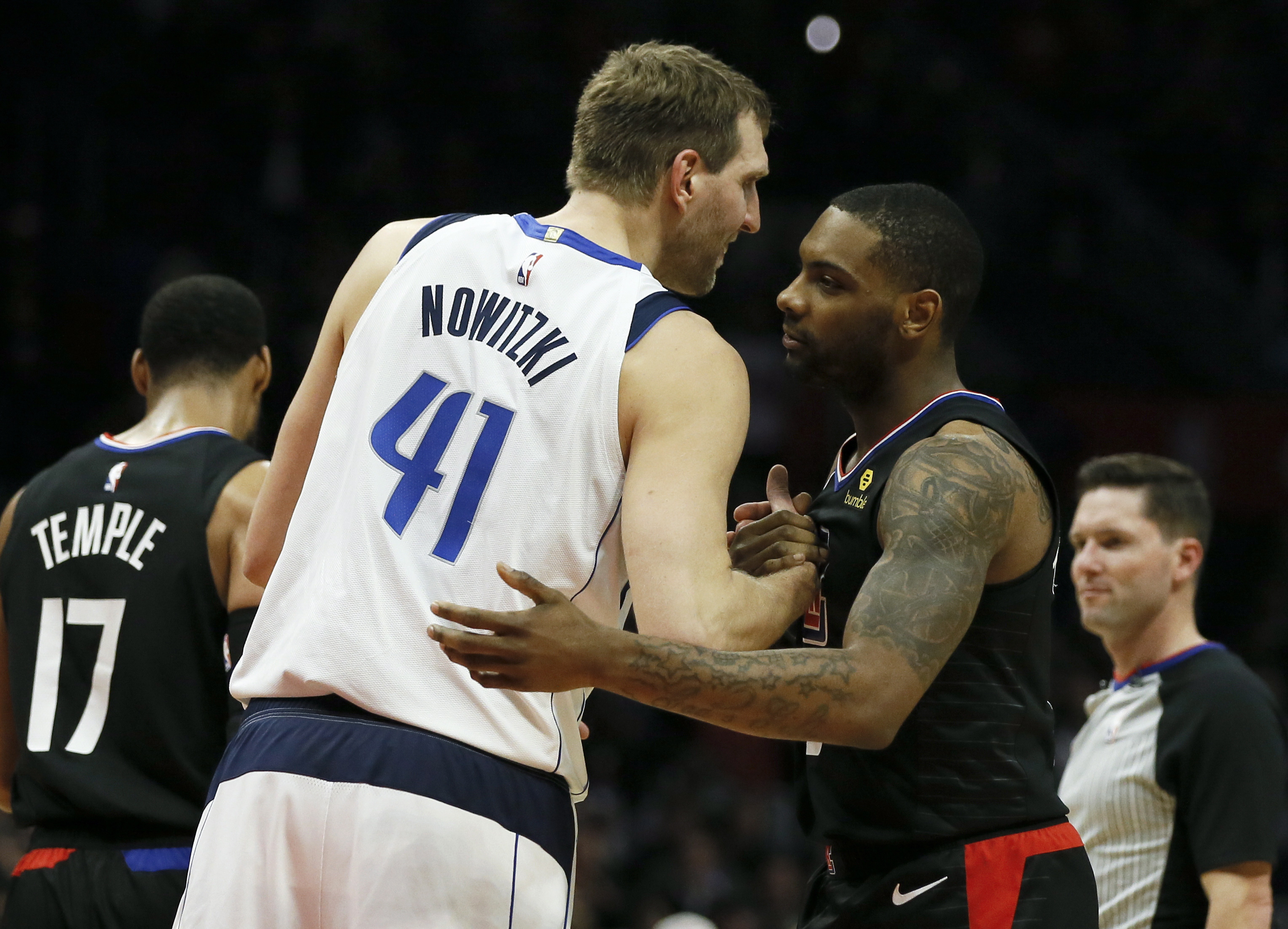 With nine seconds to go in the game, Clippers coach Doc Rivers grabbed the public address announcer’s mic to salute Dirk Nowitzki, who received a standing ovation.