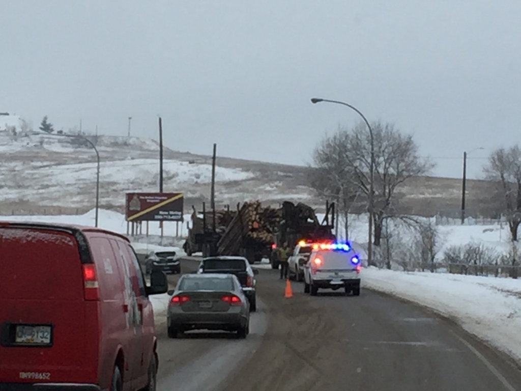 Highway 97 in Vernon is partially blocked due to a mishap involving a logging truck.