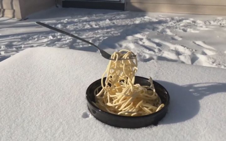 His video showed noodles and a fork suspended in the air, hardened in place at -30 C on Feb. 10.