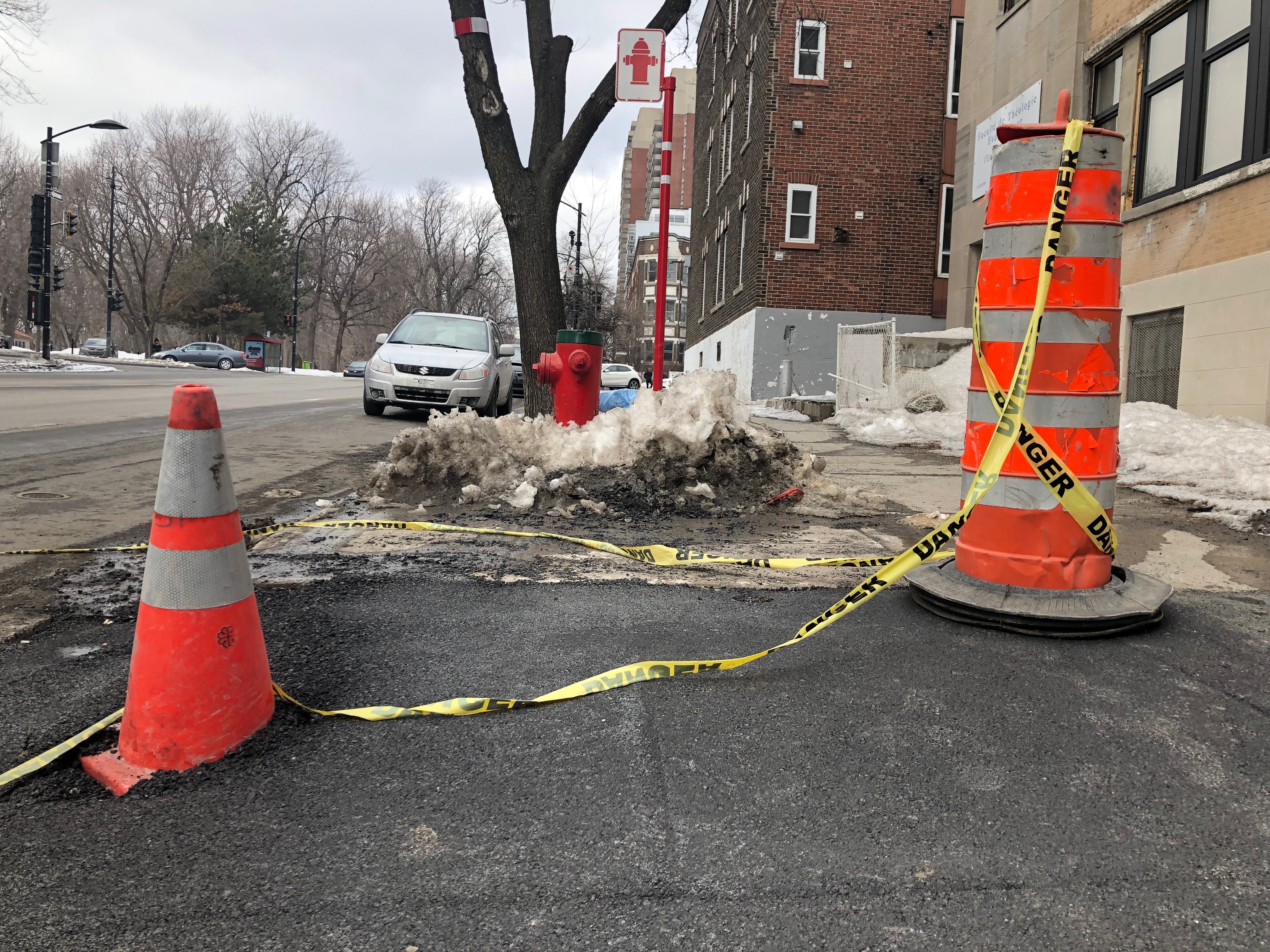 Near the corner of Papineau Avenue and Sherbrooke Street, a stretch of the sidewalk has been covered in asphalt and decked out with three orange cones. One of the cones has been paved right into the surface of the sidewalk.