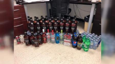 Police said 20 bottles of alcohol – including 17 66-ounce bottles of whisky – and a four-pack of Smirnoff Ice were located in the vehicle.