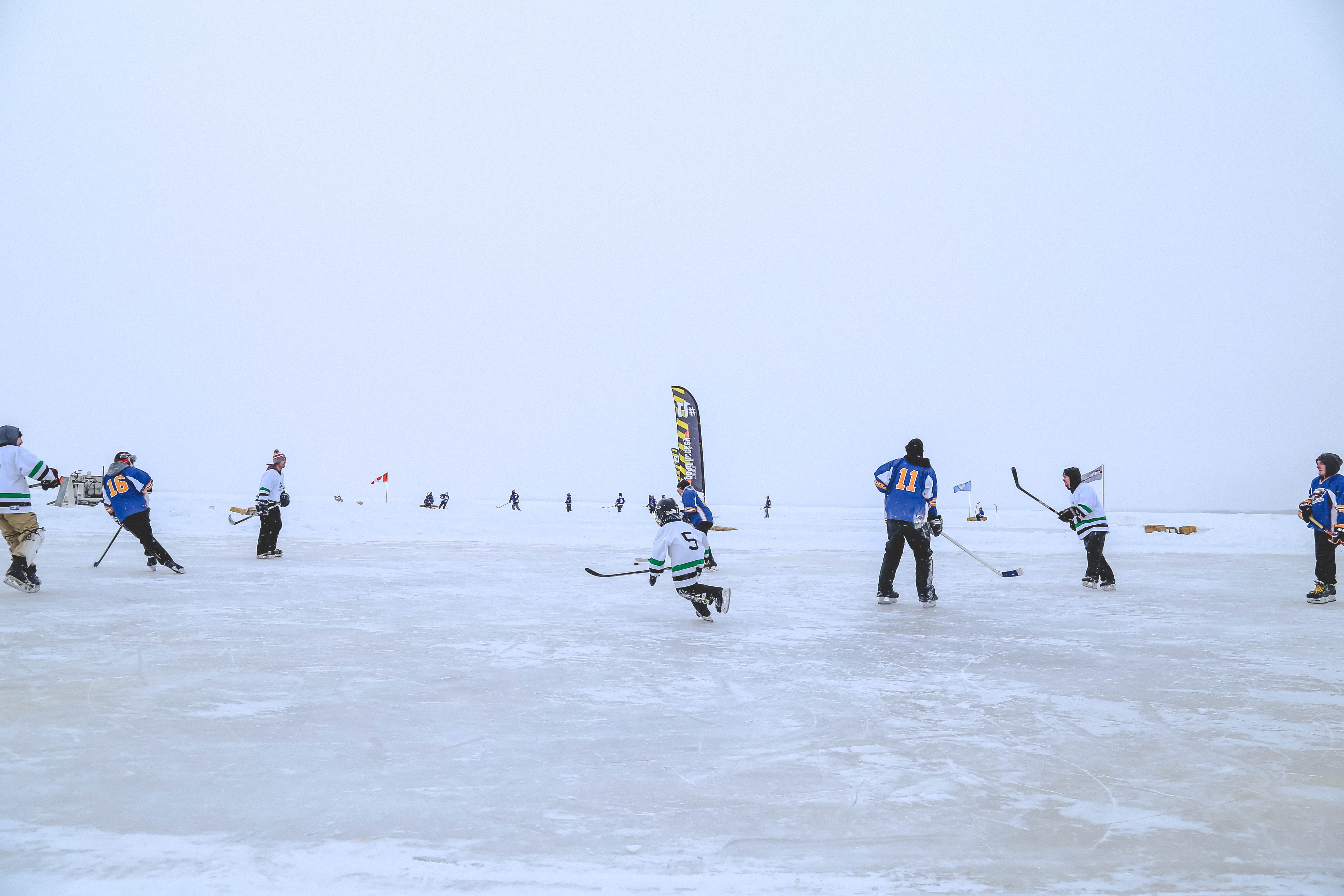 Each of the 12 rinks on Lac Cardinal are about three-quarters the size of a regulation ice surface, and the nets are just one-foot high.