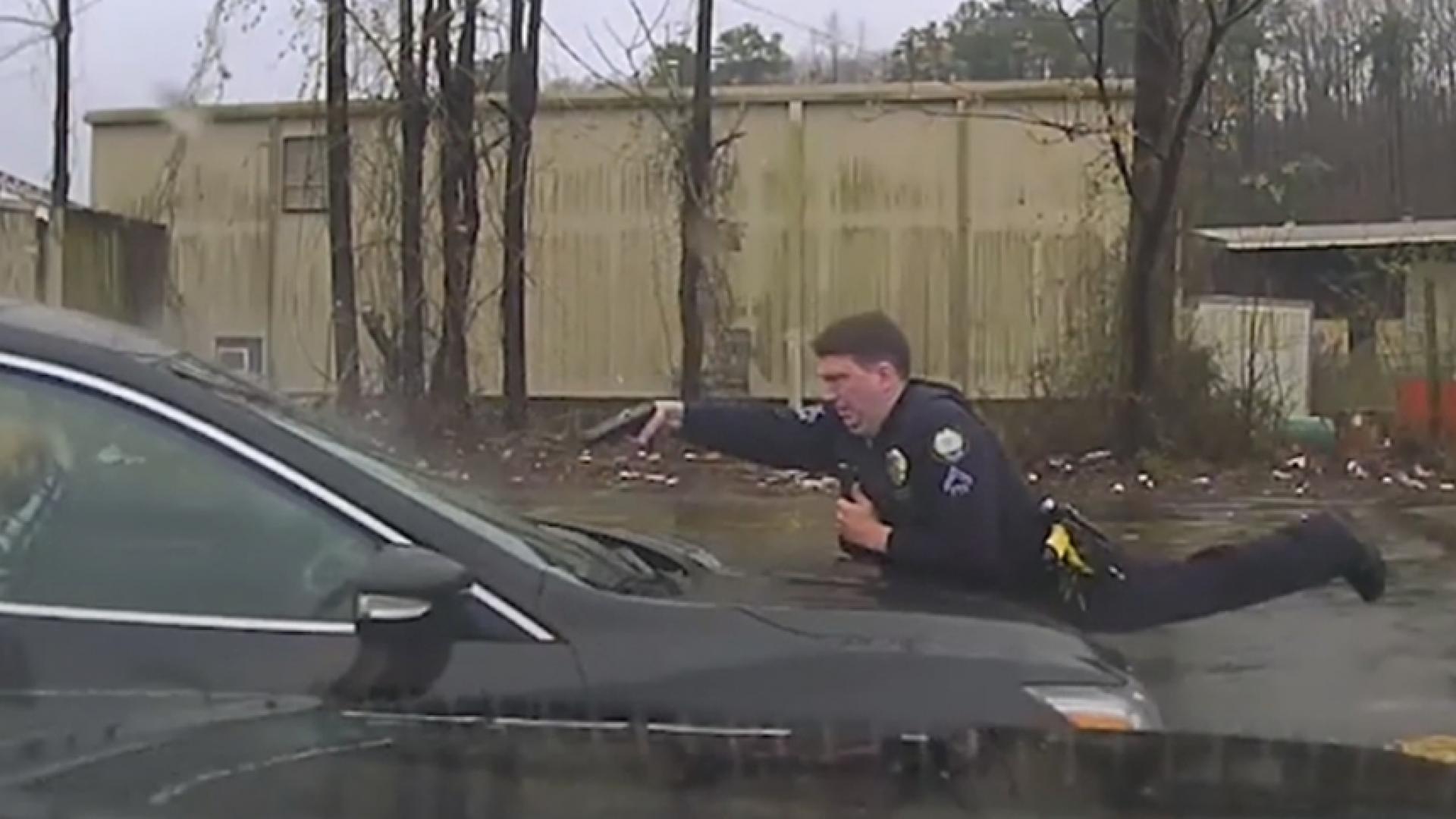 The Little Rock Police Department released footage Thursday from a deadly officer-involved shooting which shows the officer on the hood of a car firing at least 15 times into the windshield.