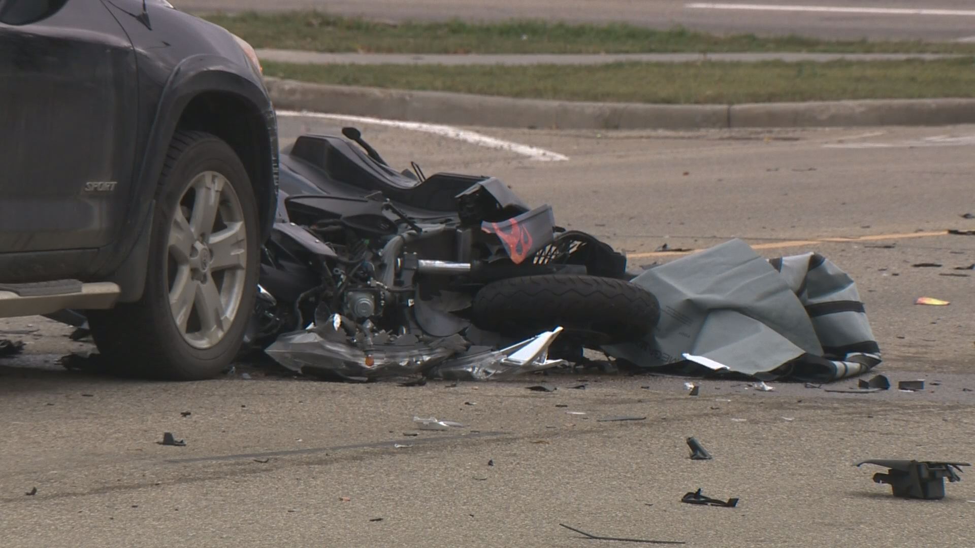Police said a 58-year-old woman was riding a Suzuki scooter south on Mill Woods Road when she was struck by a northbound dark blue GMC Terrain that reportedly crossed the centre line.