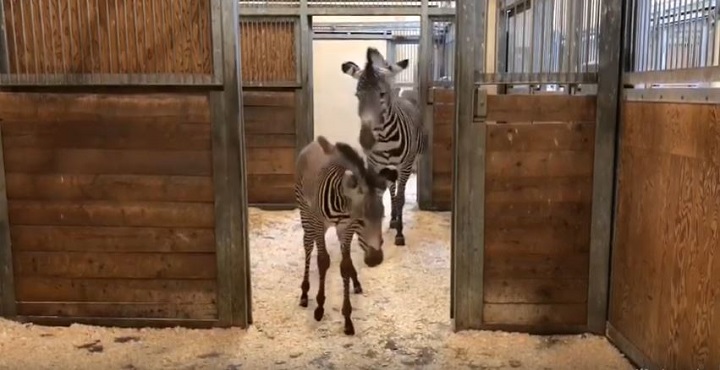 Eight-year-old Tori, a female Grevy’s zebra, gave birth to the black-and-white male foal in the early morning hours of Feb. 13.