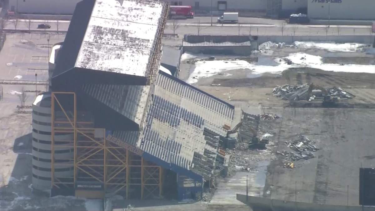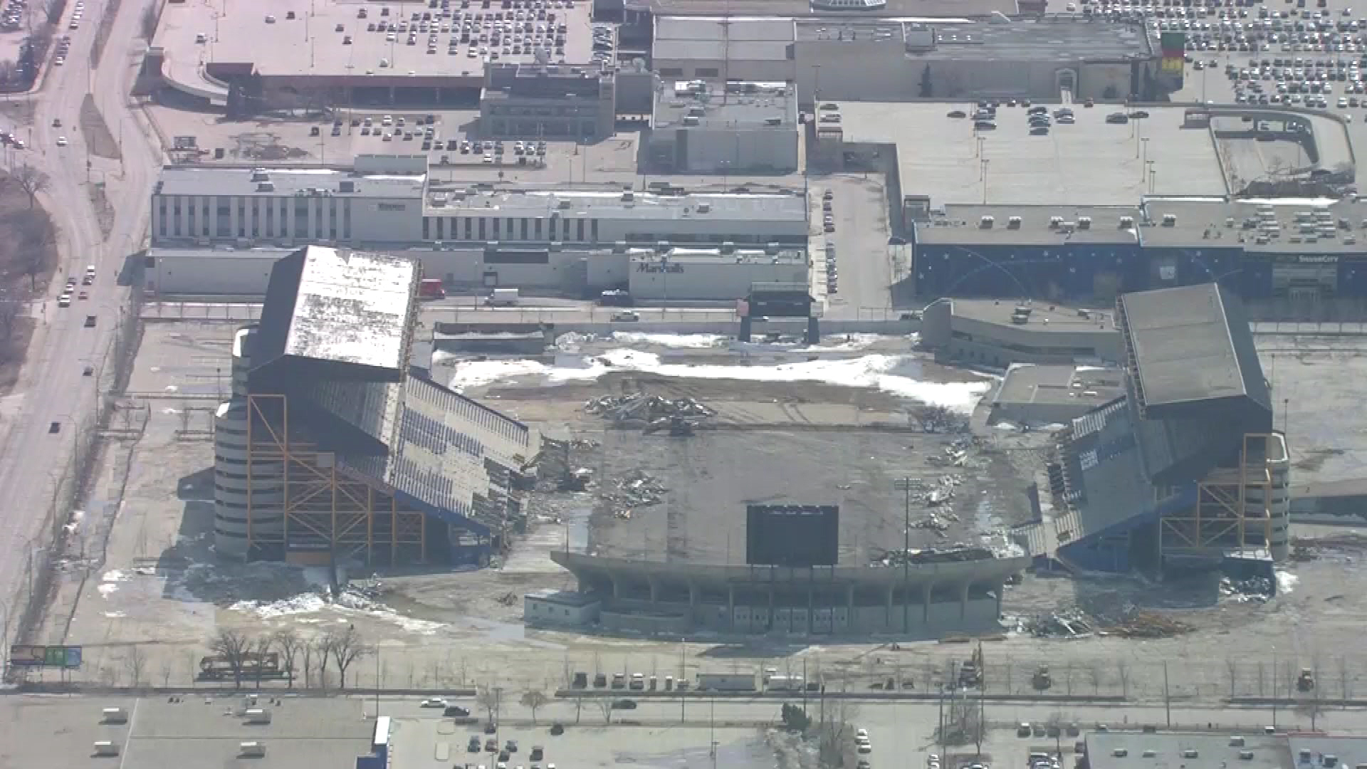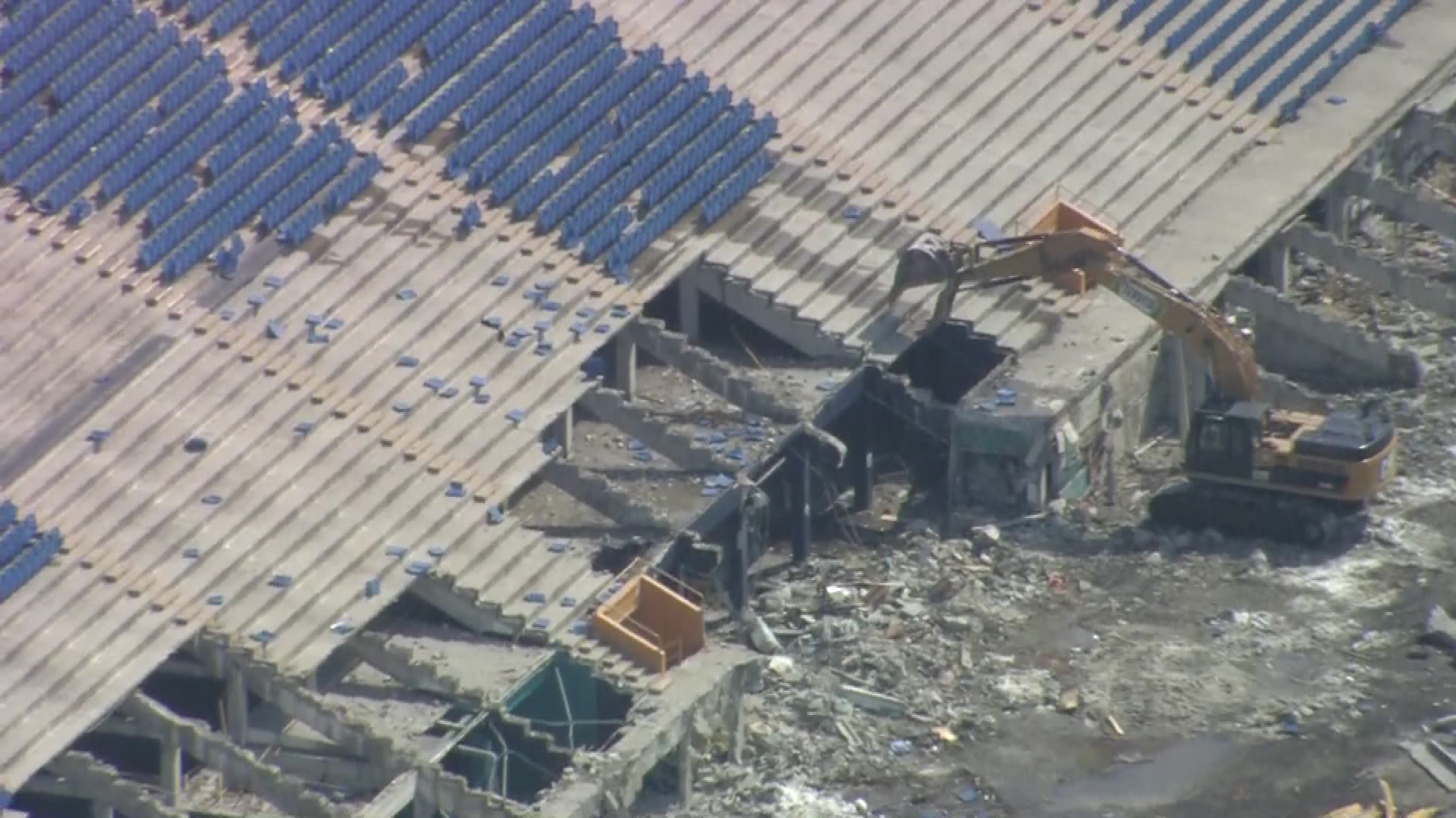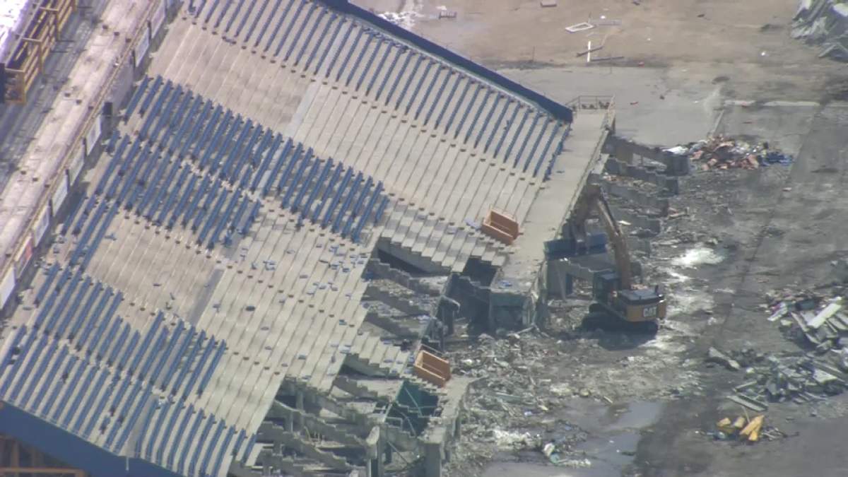 Back hoes could be seen tearing apart the stands at the huge concrete facility, which was first built in 1953 and had several additions and upgrades since then.
