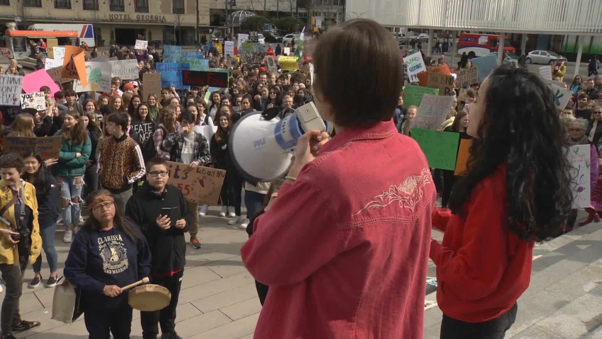 Hundreds of university and high school students walked out of class and gathered outside the Vancouver Art Gallery on Friday to join a worldwide movement calling for government action on climate change.