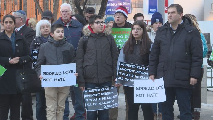 Signs read “Spread love, not hate” and paraphrased words from the Quran: “Whoever kills an innocent person, it is as if he killed all of humanity.”