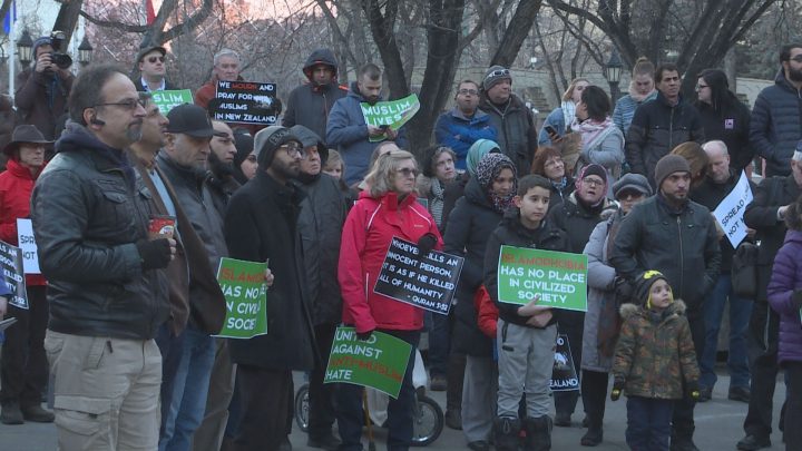 Hundreds of Calgarians stood in a circle outside city hall on Friday evening to grieve in the aftermath of the New Zealand mosque shooting that left 50 people dead.