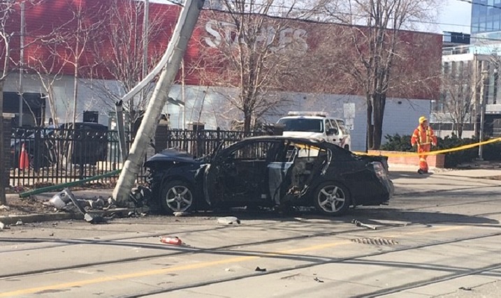 Toronto police say a driver is suffering critical burn injuries after their car crashed into a pole and caught on fire in Corktown.