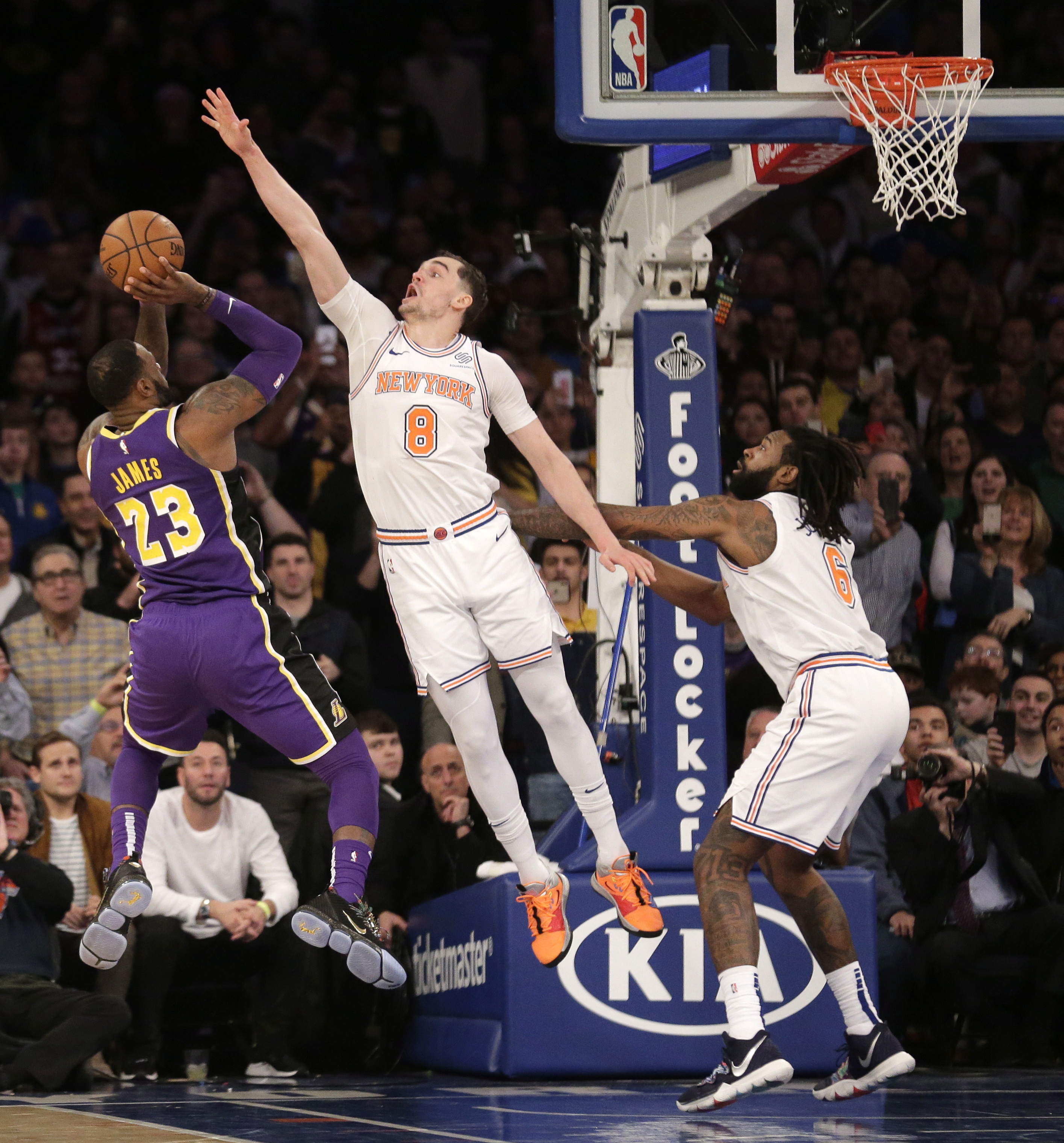 The Lakers led by 11 with under three and a half minutes remaining before the Knicks charged back, largely because of their defence against James. DeAndre Jordan also blocked one of his shots in the final minute, and James missed a jumper with the Lakers clinging to a one-point lead.