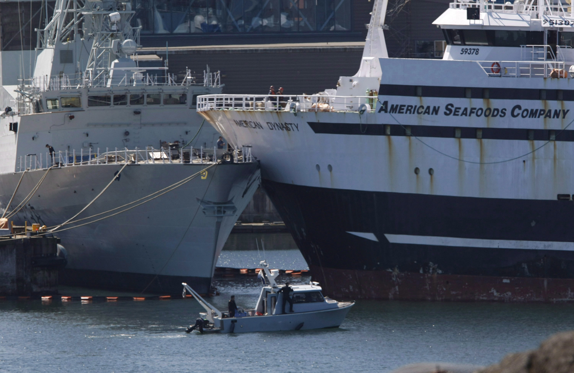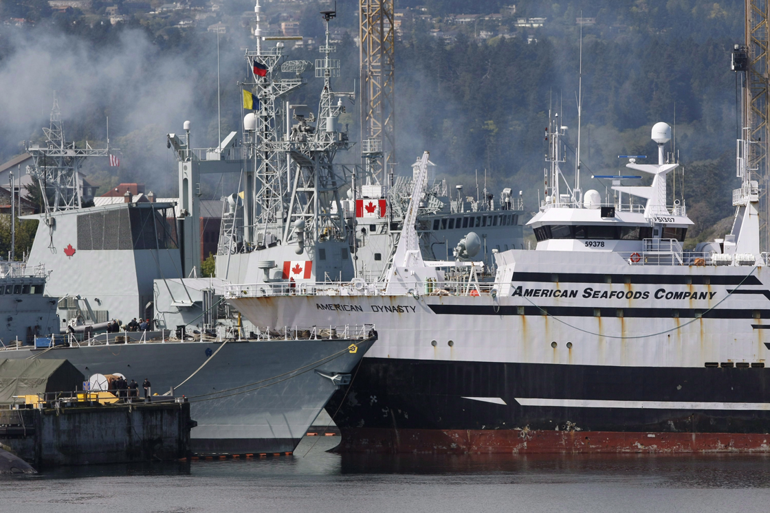The trawler, American Dynasty, spent most of Tuesday with its bow crumpled into the side of the Canadian warship, but the vessels were finally separated late in the day.