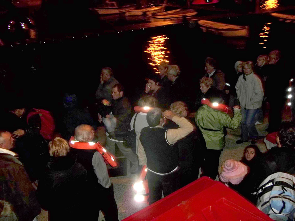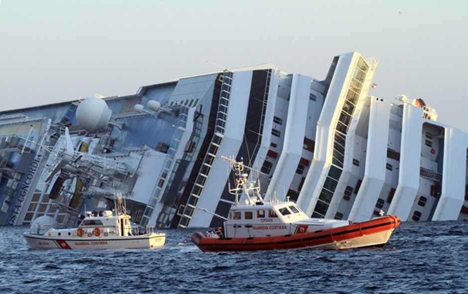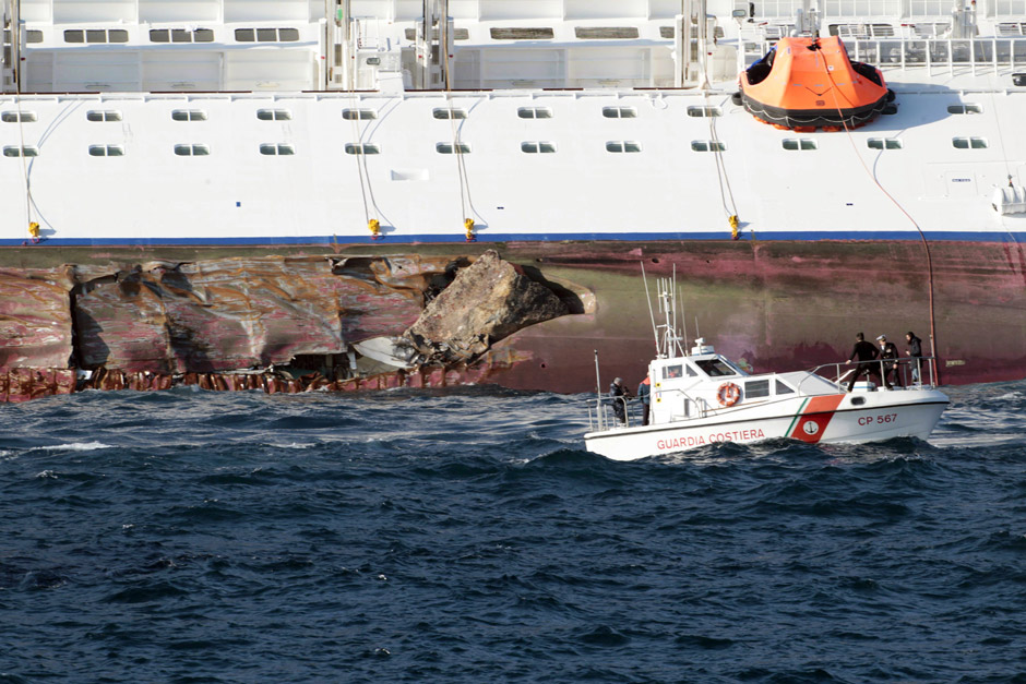 The luxury cruise liner Costa Concordia, carrying more than 4,200 people, ran aground late Friday near the coast of Tuscany, Italy. Six people died in the accident and 16 more remained unaccounted for Monday. The 290-metre long ship no lies almost flat on its starboard side, with a 50-metre long gash torn through its hull. There are almost three times as many passengers on the Costa Concordia as there are people living on Giglio Island, where the disaster occurred.