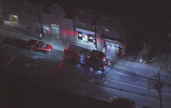Officials said firefighters arrived on scene and located a woman hanging from a second-story window above a cake shop. She was brought down by a ladder and treated for smoke inhalation.