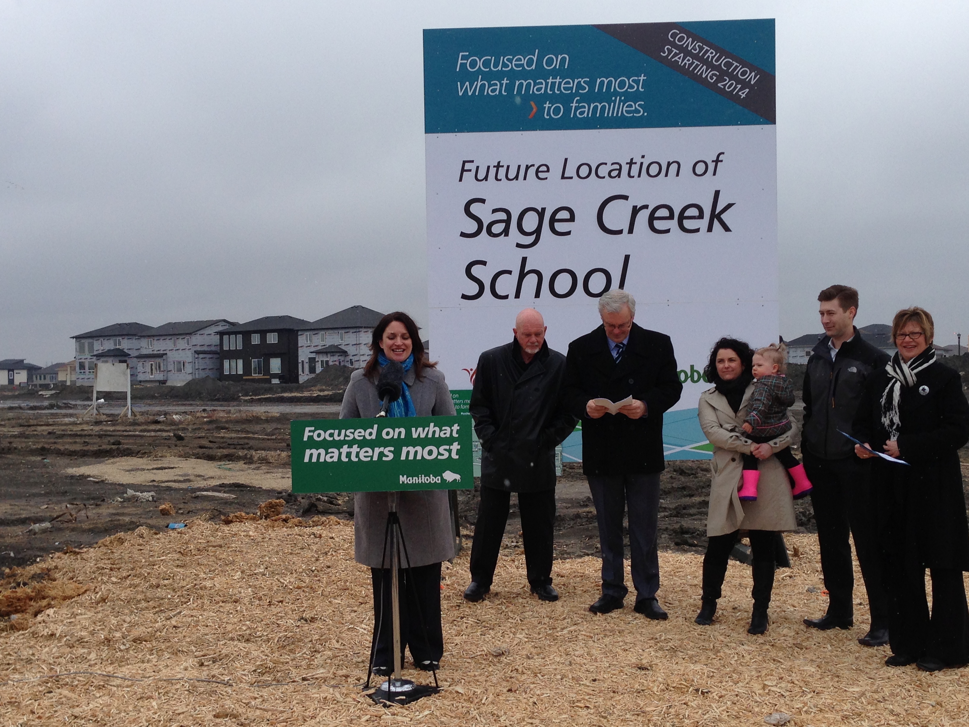 The area will get a kindergarten to Grade 8 school and a 114-space daycare, Premier Greg Selinger and Education Minister Nancy Allan announced Wednesday from the empty field where the school will be built.