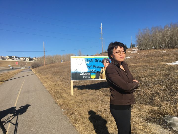 The Calgary-Edgemont candidate for the Alberta Party said she “just couldn’t believe it” when she saw one of her big signs along a Calgary roadway plastered with graffiti.