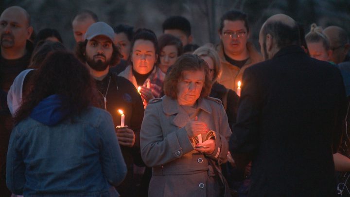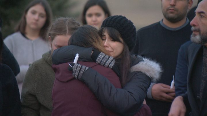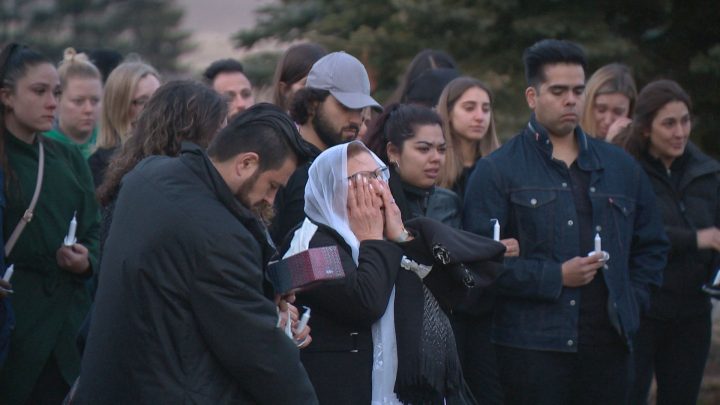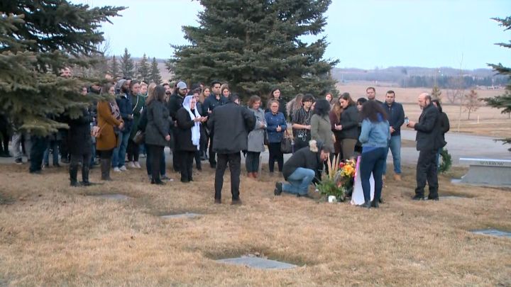 Family and friends of a young Calgary woman who was murdered by her ex-boyfriend last year gathered at her gravesite on Monday for a candlelight vigil in her honour.