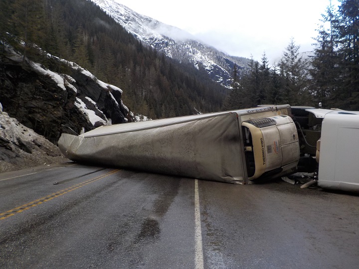 According to the RCMP, the first incident was a westbound tractor-trailer that rolled over on Tuesday at 5:15 p.m., approximately 35 kilometres east of Revelstoke. Police say the driver failed to negotiate a left-hand curve, causing the rig to roll over.