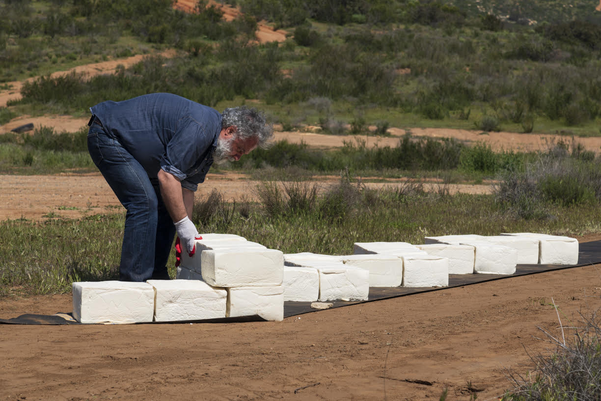 Montreal-born artist Cosimo Cavallaro began building the six-foot high cheese wall Monday in Tecate, California, out of massive blocks of expired Cotija, which costs about $100 apiece.