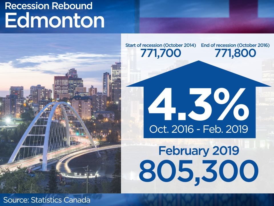 Edmonton and northwestern Alberta have seen a stronger recovery than the rest of the province. Edmonton saw 771,700 people employed in October 2014, which actually rose by 100 jobs by October 2016, according to Statistics Canada data. By February 2019, it had risen another 4.3 per cent to 805,300.