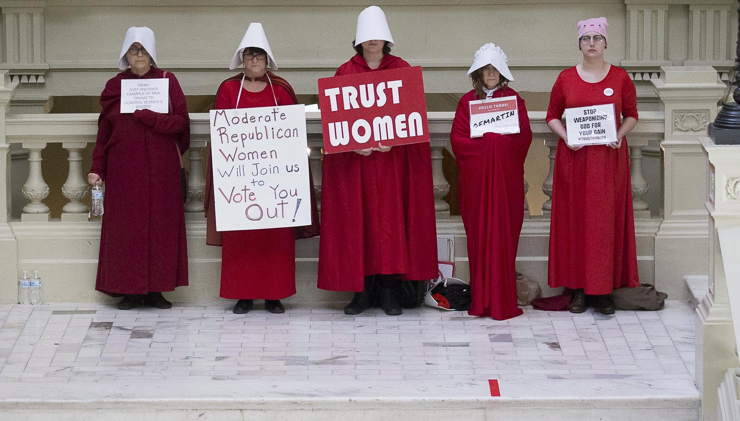 A group of women at the Georgia Capitol protested the bill dressed as characters from The Handmaid’s Tale, which depicts a dystopian future where women are controlled by the government and forced to reproduce. The activists in red cloaks and white bonnets have been an almost daily presence since the House first passed the measure earlier this month.