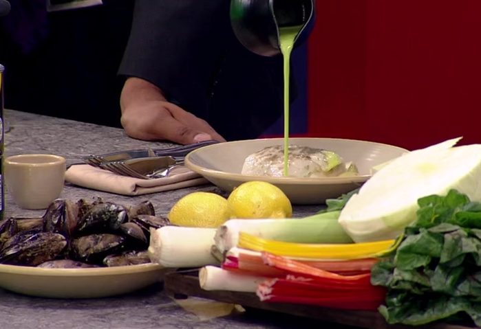 1. Place the sauce pot with the mussel stock onto the stove top. Bring to a simmer.