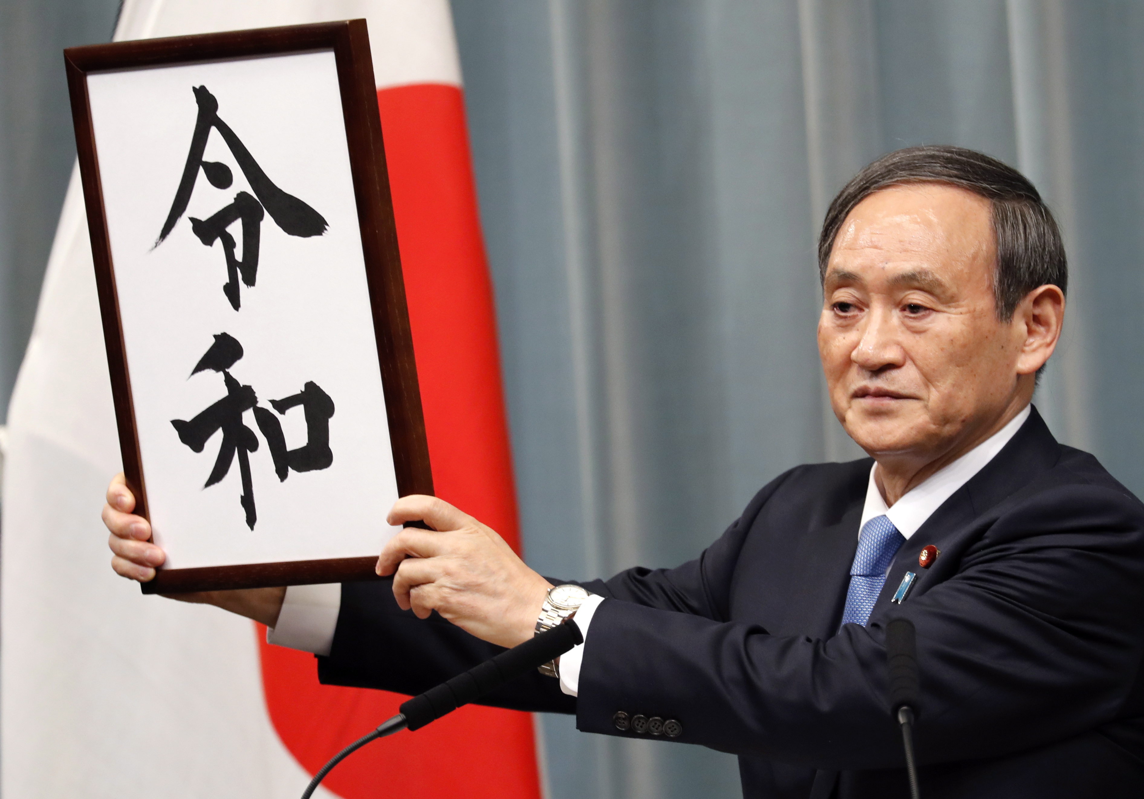 Chief Cabinet Secretary Yoshihide Suga, speaking at a news conference shown live on national television, held up a white placard with the two Chinese characters of the new era name hand-written in black ink.