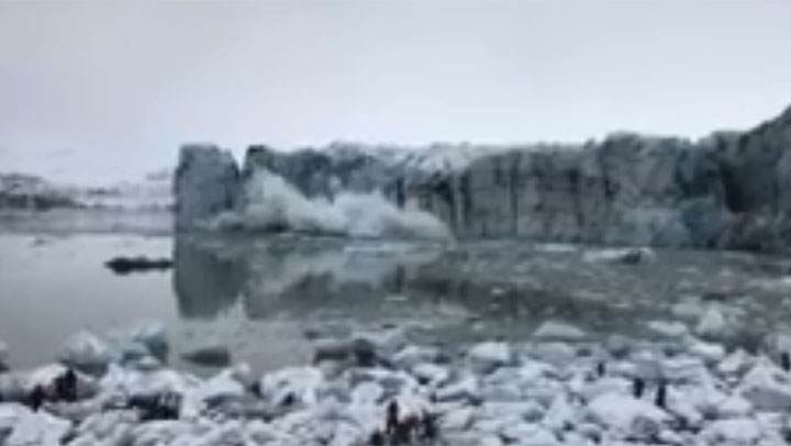 Sunday’s “enormous calving” was captured on video by Stephen Mantler, a guide for a local tourism company. The footage shows the massive slabs of ice breaking away from Breidamerkurjokull glacier and splashing down in the ice-cold water, sending large waves towards the shoreline.