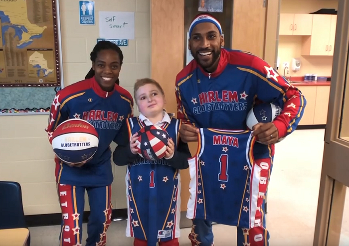 One year after meeting two members of the Harlem Globetrotters while battling a brain tumour at Toronto’s Hospital for Sick Children, Maya Kolbasnick reunited with her favourite team.