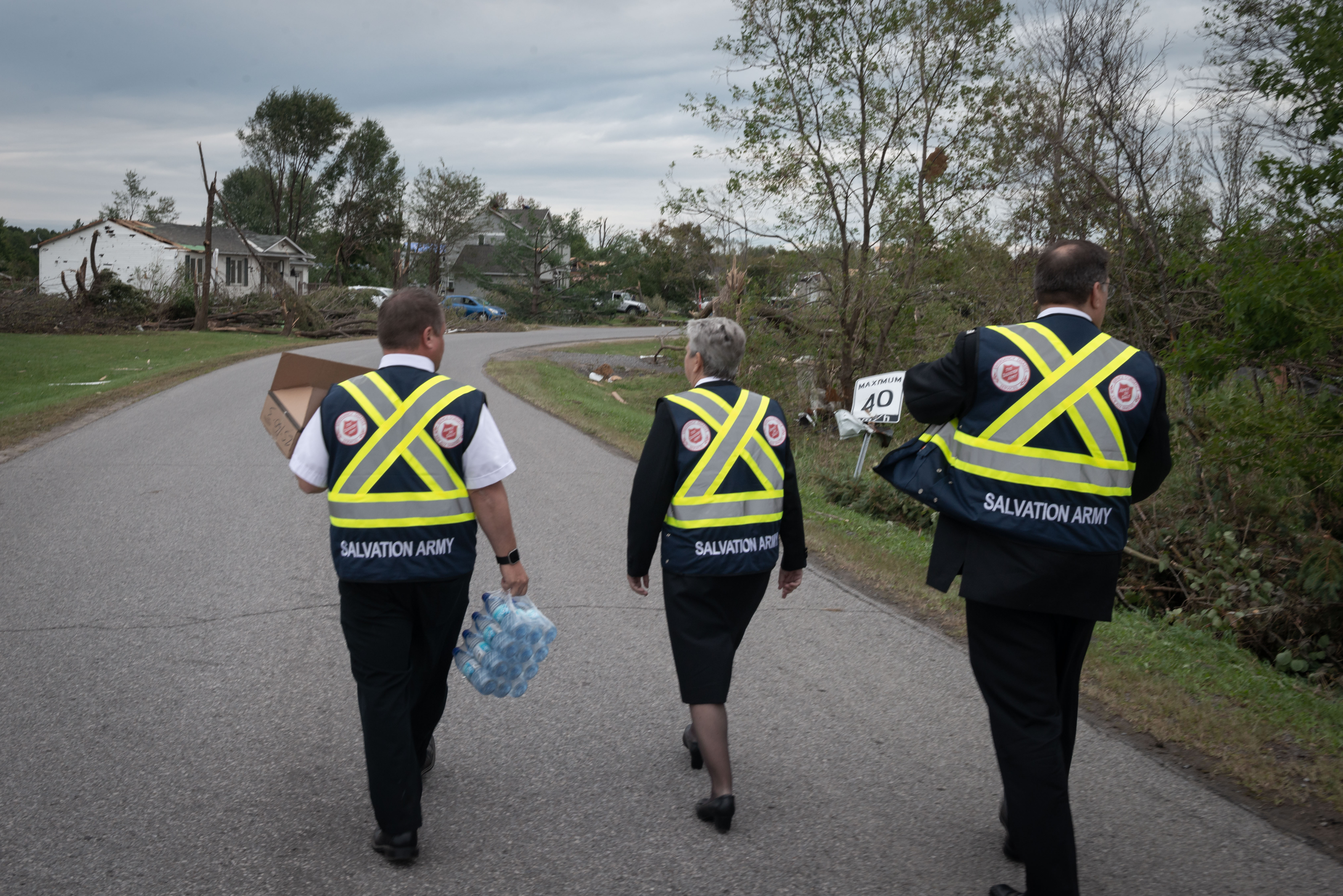 Three Salvation Army officials walk down a road in Dunrobin in shortly after a tornado ripped through the west Ottawa community on Sept. 21, 2018. They went door-to-door, handing out water bottles and checking on affected residents. Photo supplied by The Salvation Army