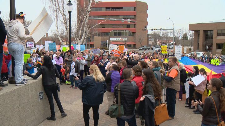 More than 100 people turned out to a rally at city hall in Lethbridge on Tuesday to support gay-straight alliances (GSAs) and LGBTQ kids.