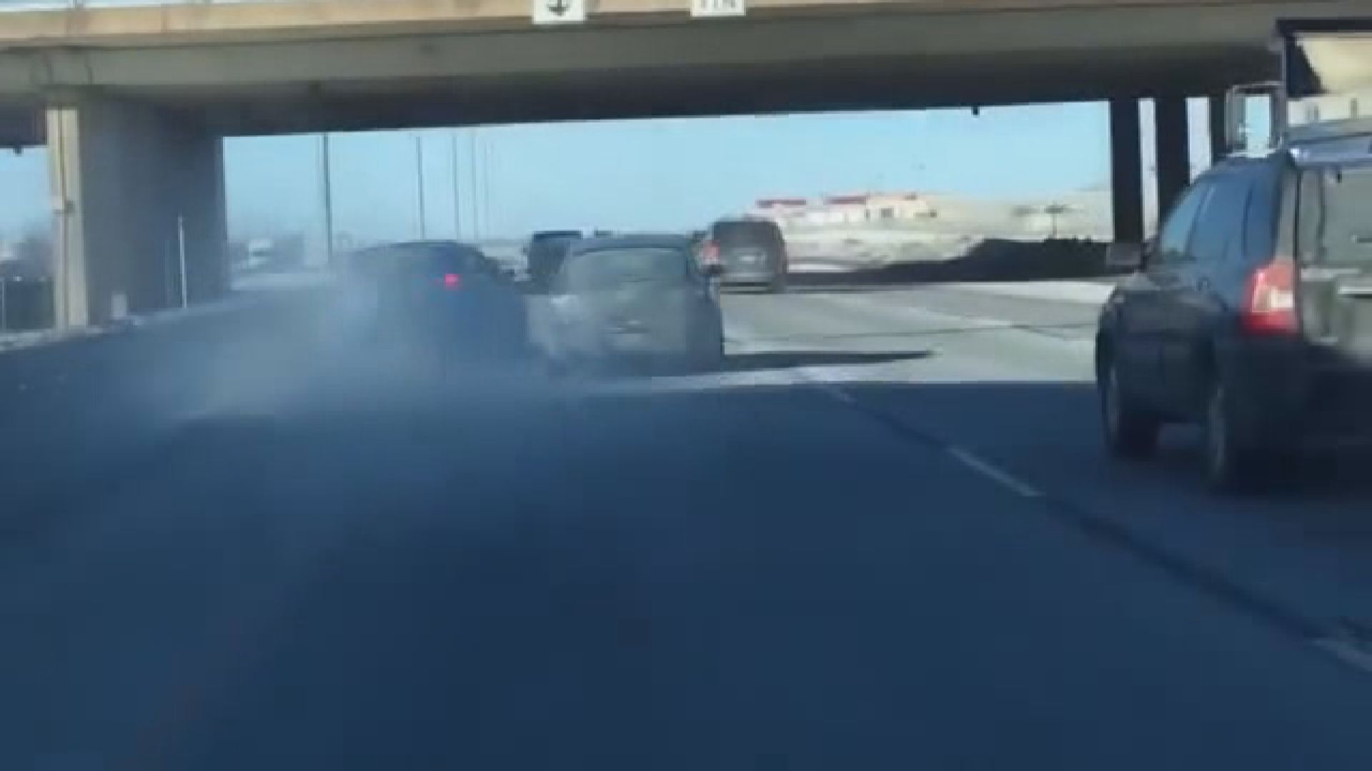 In the video, a blue Ford attempts to pass a black car in the left lane by using the shoulder of the highway. As that happens, the black car then swerves onto the shoulder in an apparent attempt to cut the Ford off.